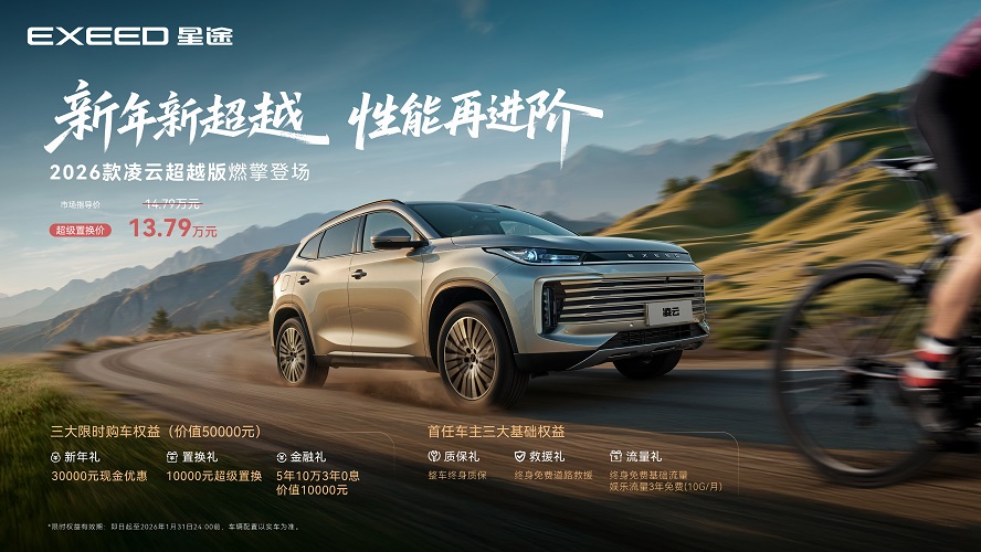 新年启新程,超越再进阶。星途品牌正式启动“新年新超越,人生再进阶”主题活动,旗下旗舰SUV 2026款揽月超越版与性能标杆 2026款凌云超越版同步上市。揽月超越版官方指导价为18.79万元,限时超级置换价为17.79万元;凌云超越版官方指导价为14.79万元,限时超级置换价为13.79万元。