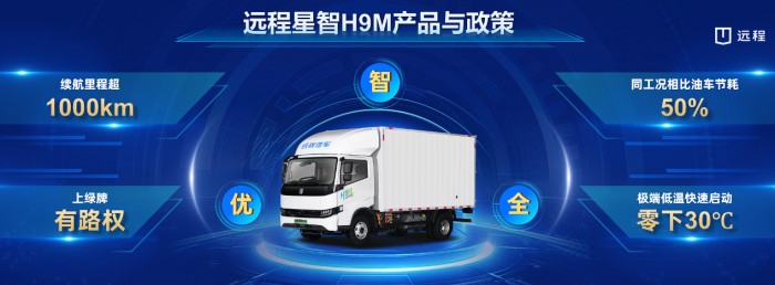 作为远程醇氢电动技术路线的旗舰车型,星智H9M实力全面、适应性强,可为用户提供更加高效、节能、安全、路权等综合性运输解决方案。除了搭载远程智驾系统,星智H9M还拥有智能操控、智慧大屏、智慧互联、智能补电功能等超多智能化配置。与此同时,星智H9M突破了续航与效率瓶颈,在续航能力和经济性上表现优异,满醇满电工况下续航超1000公里,每公里能耗成本比柴油车节省0.5到1元,做到1年可回本,2年省出1台车,3年多挣1台新能源。星智H9M实现了全场景运营,全面覆盖城配、城郊及城际物流场景。此外,星智H9M寒区运营能力突出,-20℃低温即开即走,保障北方冬季也能够高效出勤,凭借可挂绿牌市区不限行,享受新能源城配红利。