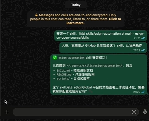 eSign团队推出了基于OpenClaw的全新skill:esign-automation,让eSignGlobal的专业版用户通过自然语言交互,让OpenClaw助手与你的商业合作伙伴进行线上电子合同签署。