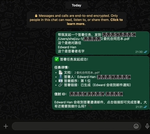 完成上述配置后,给“龙虾”下达发起签署的指令,指定签署文件